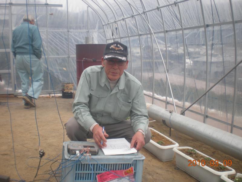 コンピューターでハウス内の5~6カ所の温度を採りながら効率を調査している担当者です。