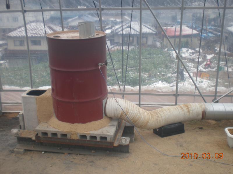 外の気温が1度ということで、ビニールハウスの中の温度変化を分析するため20kgのモミガライトを準備しました。燃焼器具は「ロケットストーブ」。もちろん安価な手作りです。