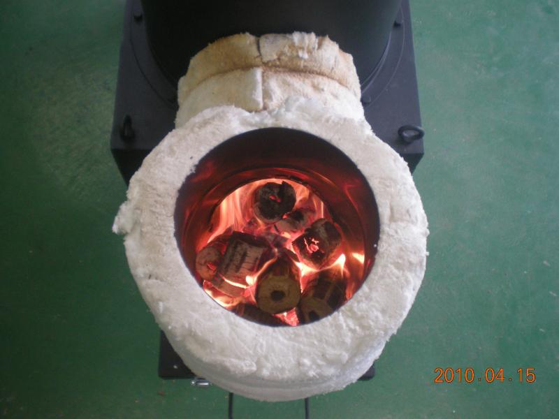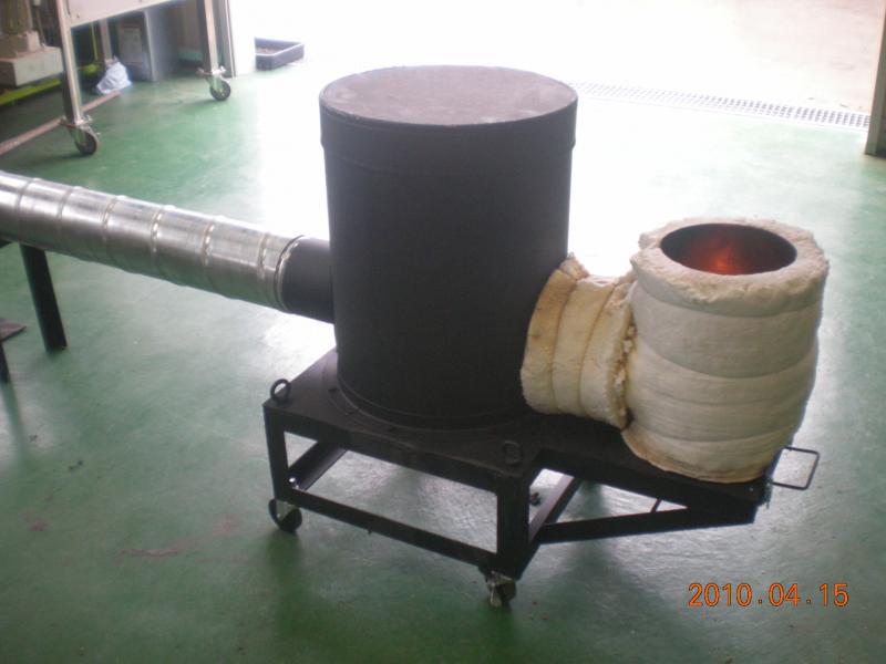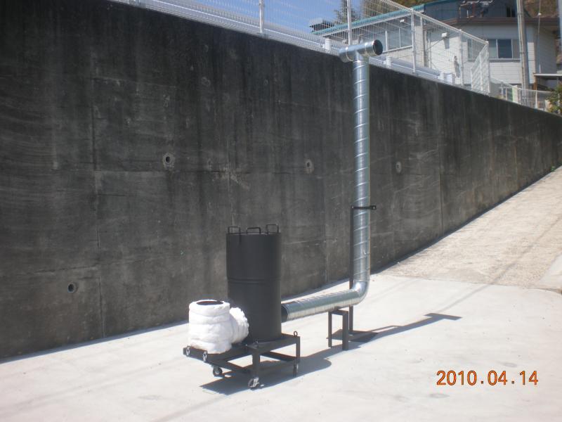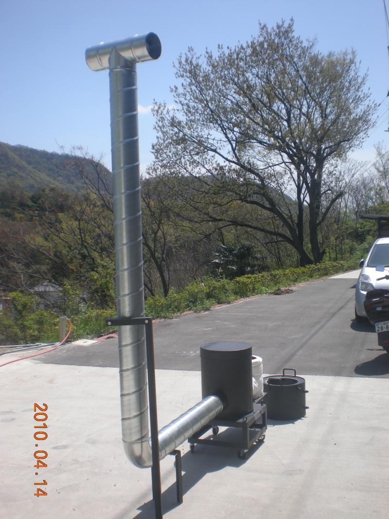 外観はこのようなものですが、燃焼本体のみ提供して、ダクト類は地元で既製品を求めると安上がりの装置完了です。