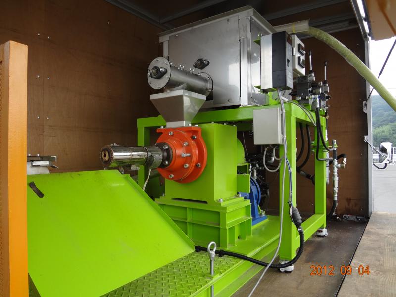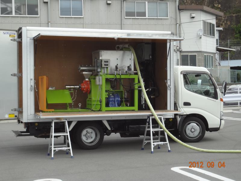 モミガライト製造機本体を、トラックのエンジンで油圧モーターを駆動させて運転します。
