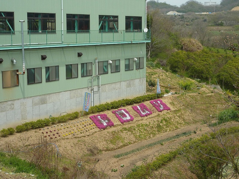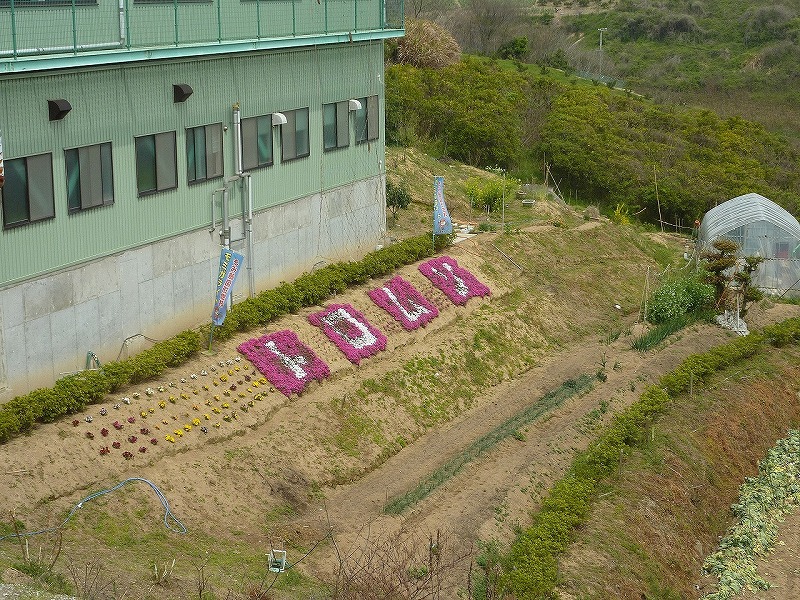 花文字の右端に見えるビニールハウスで、モミガライトを燃焼させるロケットストーブを設置しています。