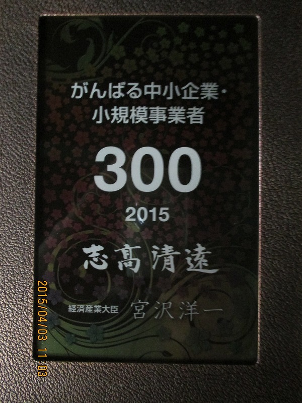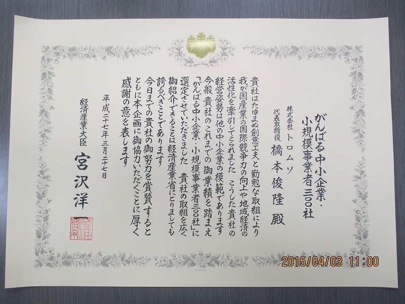 NEWS がんばるトロムソ、もみ殻利活用 2015.04.03 「がんばる中小企業・小規模事業者300社」株式会社トロムソの取り組みを広く紹介してあげましょう・・・ということです。この感謝状を額縁に入れて事務所の壁に掛けることになりました。なぜって??初めてこんなものを頂いたからです。盾は無造作に社長室に・・・・株式会社トロムソ、省エネルギー、地球温暖化防止に微力ながら貢献できるよう、もみ殻利活用ビジネスを続けます。 Post Share Hatena Line RSS feedly Pin it note 地球のことを時には真剣に考えなきゃ 前の記事 アフリカタンザニア・ナイジェリアから研修生が因島に 次の記事