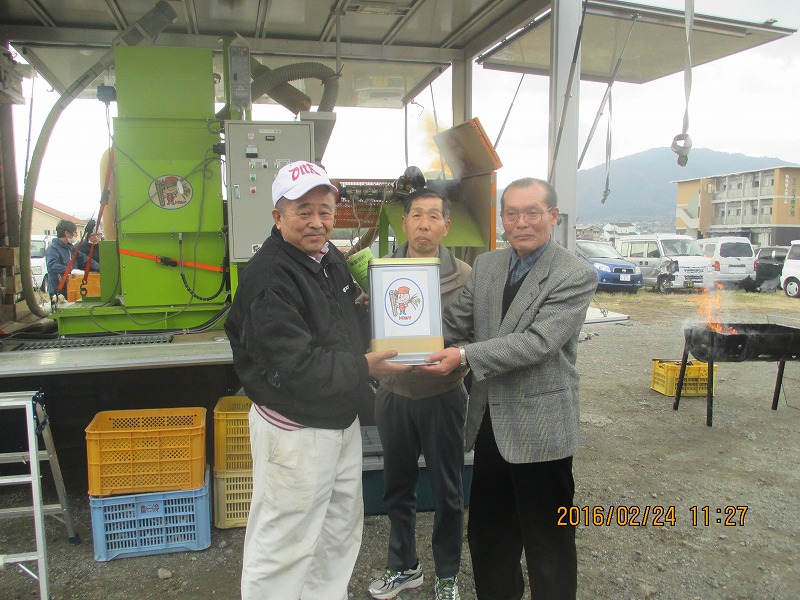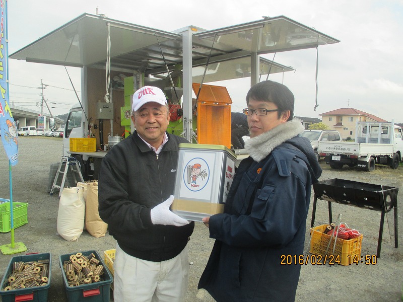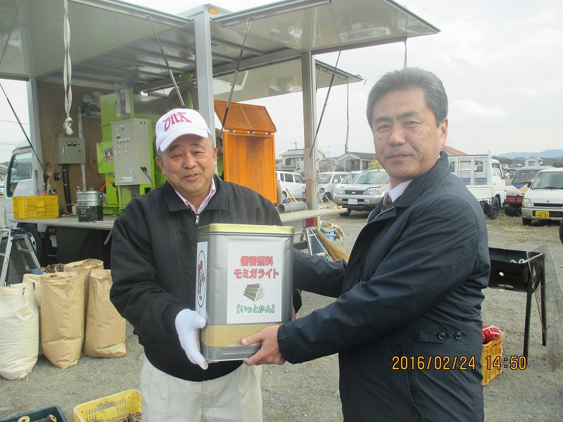 2月23日、冷たい雨と強い風の中、四国愛媛県西予市のJA様を会場にして、モミガライト製造デモを行ないました。