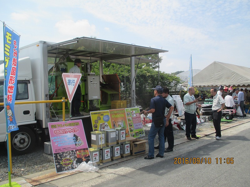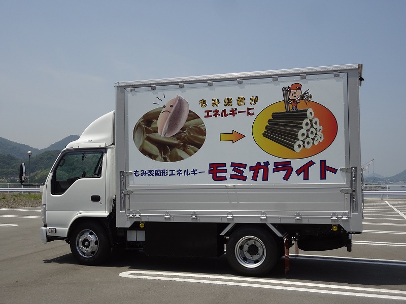 写真のトラックは、グラインドミルを搭載した『モミガライト製造実演車』です。