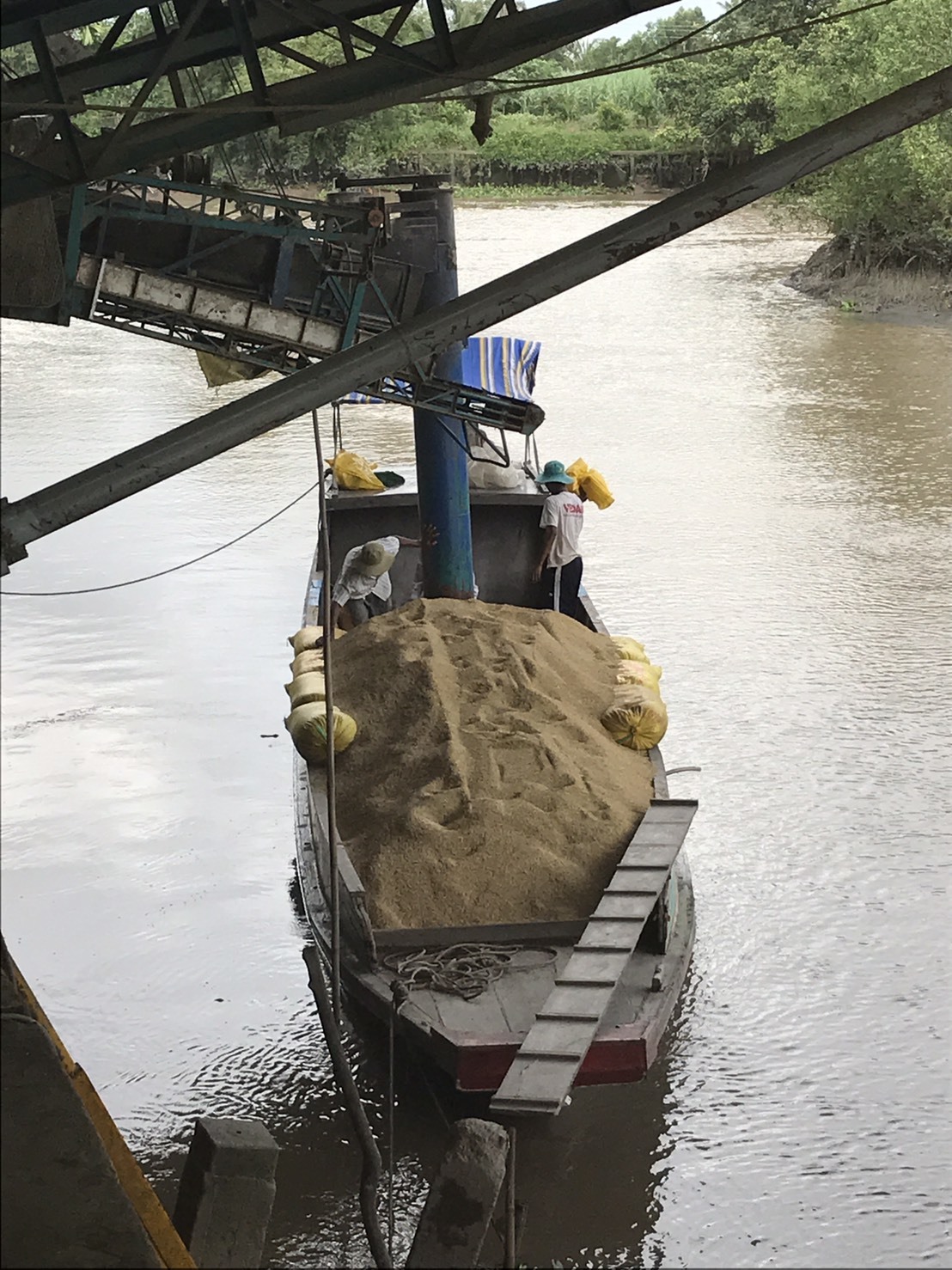 船に乗せて、籾を搬送しています。