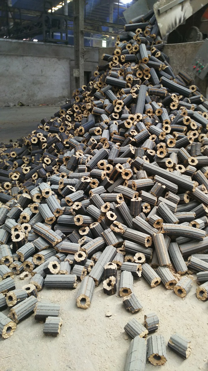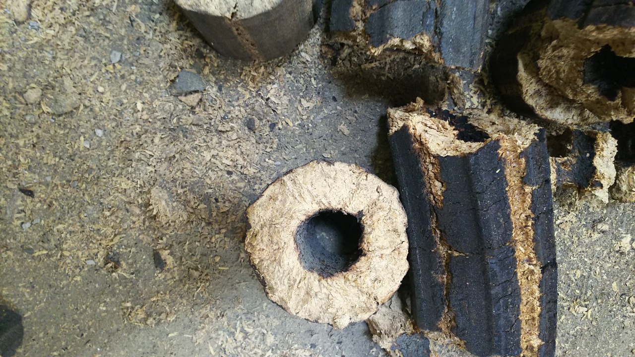 製造されたブリケット断面にもみ殻の形が残っているのが見えます。