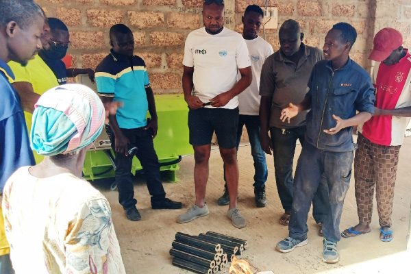 クマシでは電圧不足という課題が生じましたが、現地チームと連携し発電機を導入するなど、柔軟な対応を行いました。また、原料の品質維持のために屋根付き・コンクリート床の保管倉庫整備の必要性についても助言しました。タマレでは、トレーニング最終日に参加者全員で生産したブリケットの着火テストを行い、安定した燃焼性能を確認しました。
